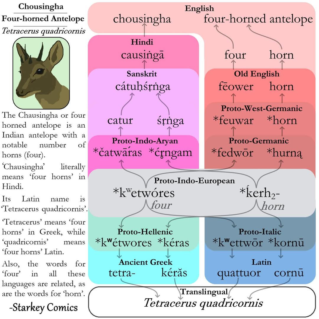 - Ryan Starkey of Starkey Comics never disappoints with his infographics. Here's a fun one about the etymology/etymologies for Tetracerus quadricornis, the four-horned antelope: