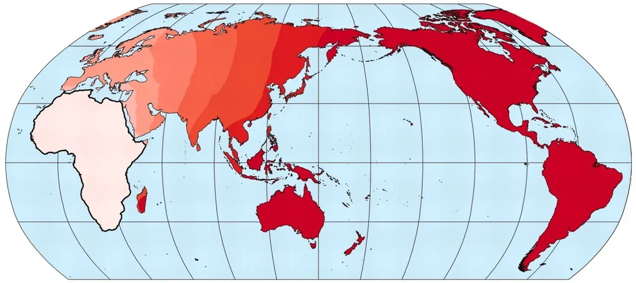 This map shows the likely location of a single language origin under a founder effect model of phonemic diversity (controlling for population size) inferred from the mean diversity across language families. Lighter shading implies a stronger inverse relationship between phonemic diversity and distance from the origin and better fit of the model. The most likely region of origin is the area of lightest shading outlined in bold. From Atkinson (2011).