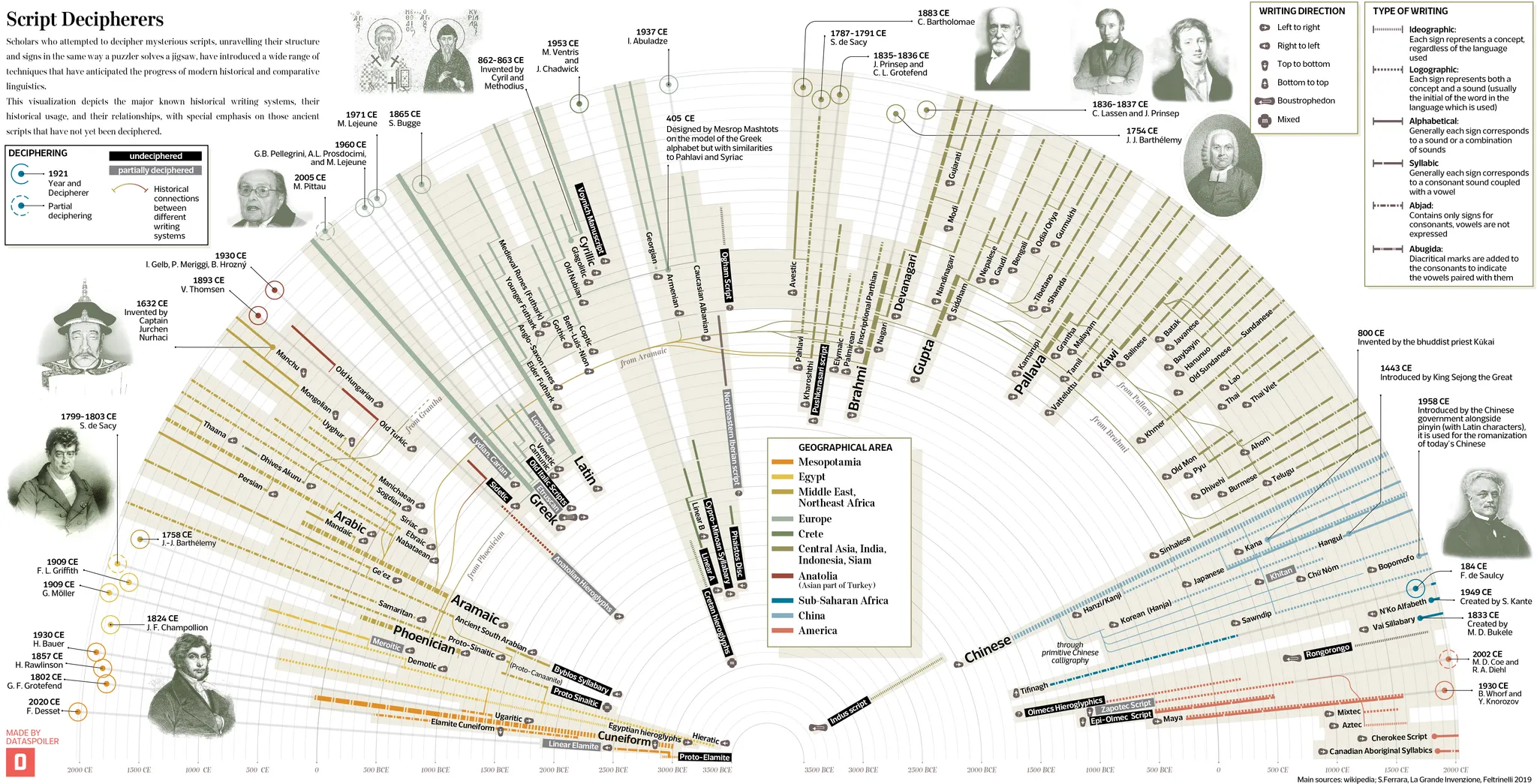 To kick things off this week, check out this incredible visualization of the history of writing systems (and their decipherers!), by Marco Giannini of Dataspoiler, a visual design firm (Instagram: @Dataspoiler).
