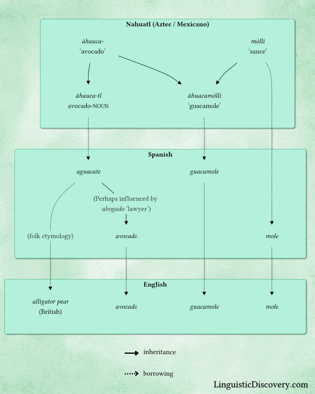 Here’s the complete etymological tree for guacamole and its related words in English: