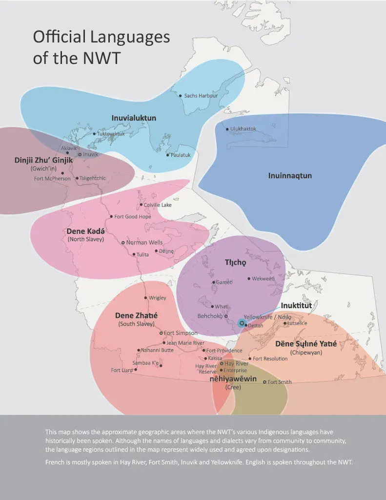While doing research for my article on Trump’s official English order the other week, I came across this neat map produced by the government of Canada’s Northwest Territories, showing the regions where the official languages of the territories were spoken historically: