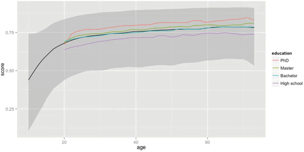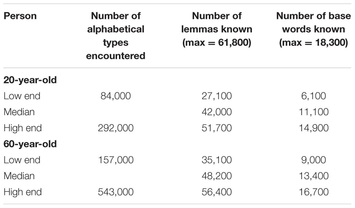 This is a surprisingly difficult question to answer! For starters, the answer varies based on whether you’re examining active vocabulary (words you actually use) versus passive vocabulary (words you recognize or understand but don’t use). One clever experiment estimates that the average 20-year-old knows about 42,000 words passively, while the average 60-year-old knows 48,000 words. I was actually quite surprised that the number grew that much in adulthood! It just goes to show that our linguistic abilities continue to develop over the course of our lifetimes (albeit to a lesser extent than in childhood).