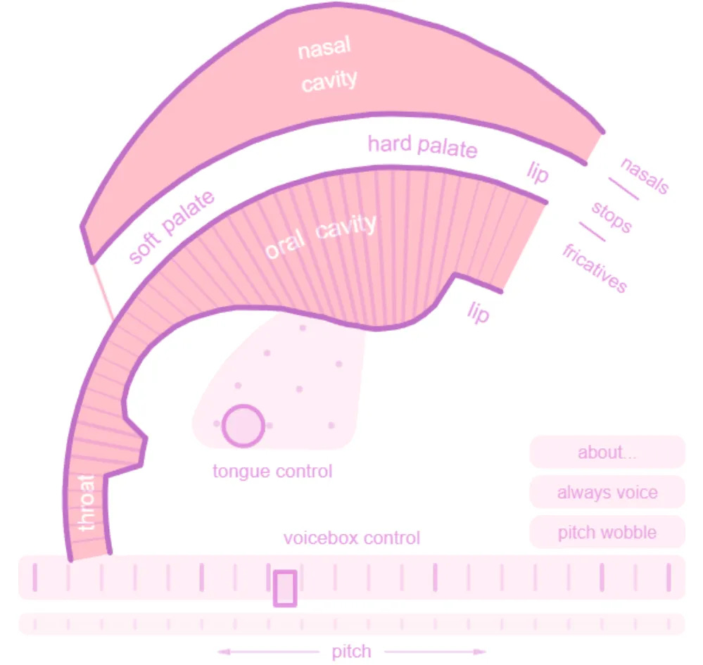 If you haven’t encountered Pink Trombone before, you won’t be disappointed. It’s a sagittal section (vertical cross-section) of the vocal tract that you can manipulate to create different sounds!