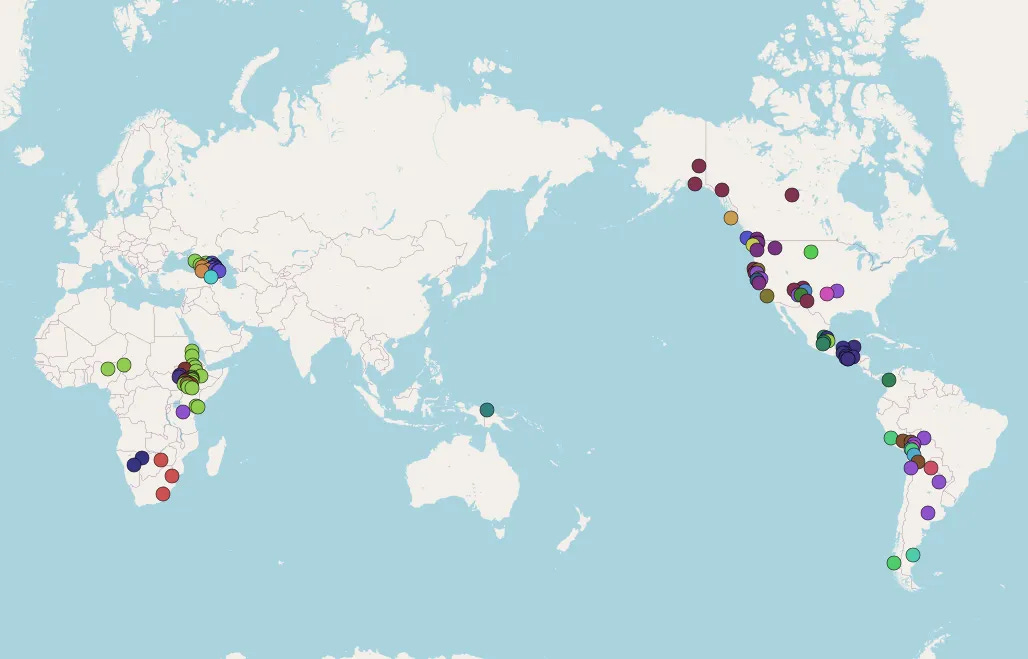PHOIBLE is a database of the sounds in 2,168 of the world’s languages. You can explore which languages have which sounds and lots more. This is a map of all the languages in the database which have the /tʃʼ/ phoneme (a palato-alveolar ejective affricate). You can see that the sound is prevalent in the Americas and parts of Africa, but largely absent from the rest of the world.