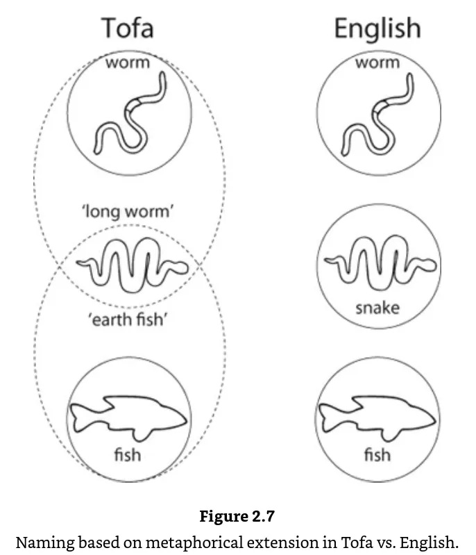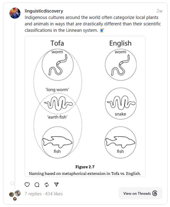 The graphics in that thread are taken from one of my favorite pop linguistics books, all about indigenous knowledge systems: