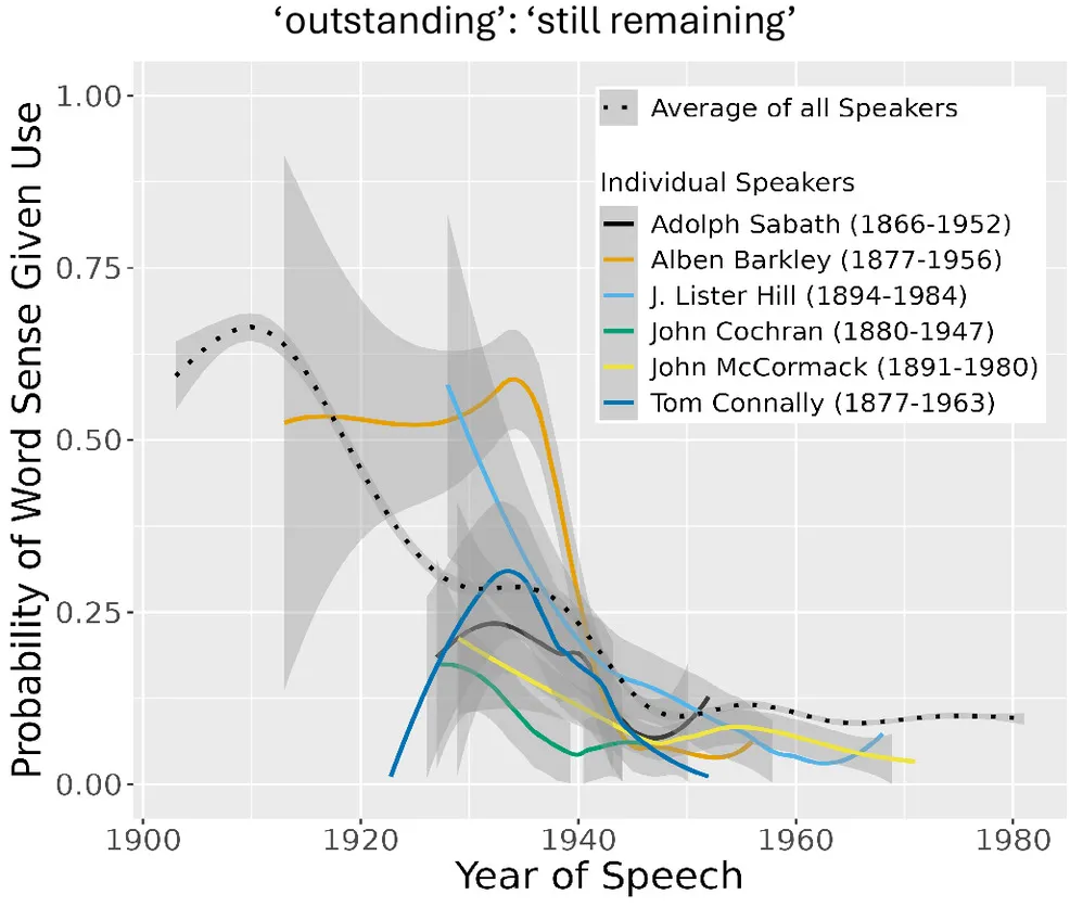 Now, a recent study shows that the meanings of words in a person’s lexicon can also change over the course of their lifetimes. It’s not just kids that use existing words in new ways. In fact, sometimes older speakers are even on the leading edge of semantic changes in society. The study analyzed over 7.9 million U.S. congressional speeches from 1873 to 2010, focusing on 100 words that were thought to have undergone significant shifts in their meaning during that time period. They found that individual representatives did indeed change the way they used these words over the course of their careers giving speeches. Here’s a neat graph showing how some specific representatives decreased their use of outstanding to mean ‘still remaining’ (as opposed to ‘standing out’) over their careers.