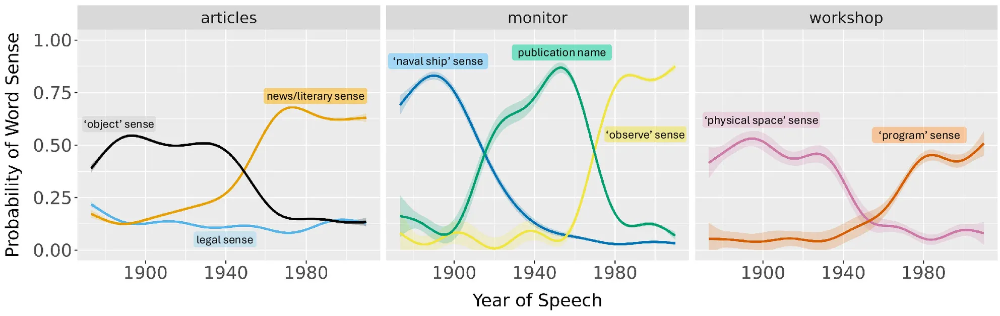 And the following graph shows some semantic changes in the aggregate. For example, article originally meant ‘an object’ (e.g. an article of clothing), but shifted to mean ‘a news/literary item’ (e.g. a news article), and you can see that semantic shift happen over the period of years examined in the corpus.
