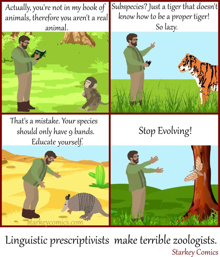 Ryan Starkey (Starkey Comics) explores what zoology would be like if zoologists applied prescriptive linguistic principles to their field.