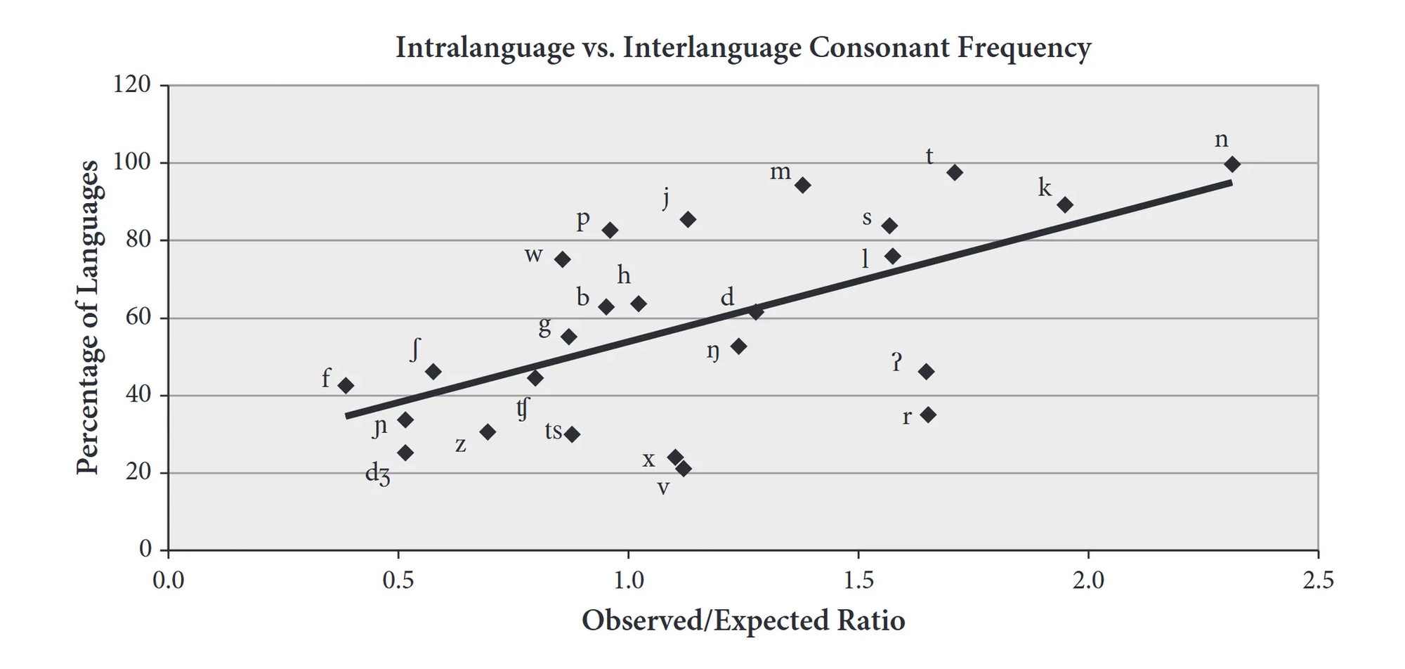 But the frequency of /n/ in English surprised me for another reason too: We know that there’s a strong correlation between the number of languages that have a sound and the frequency of that sound within individual languages (Gordon 2016: 74). The following chart demonstrates this, showing the intralanguage vs. interlanguage frequency of different consonants.