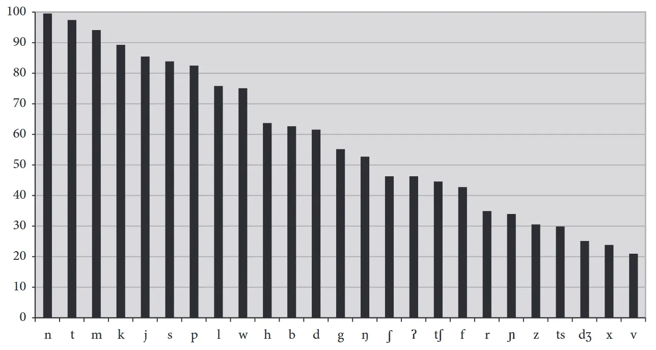 It’s unclear to me where this claim comes from, and I’m not able to replicate that statistic using the well-known phonological databases UPSID or PHOIBLE. In reality, the most frequent consonant in the world’s languages is not actually /t/, but—you guessed it—/n/! It turns out that the frequency rank of /n/ in English actually does match its rank crosslinguistically, in line with the pattern we saw above. And while /p, t, k/ are among the most frequent consonants crosslinguistically, they compete with /m/, /j/, and /s/, as the following chart shows.