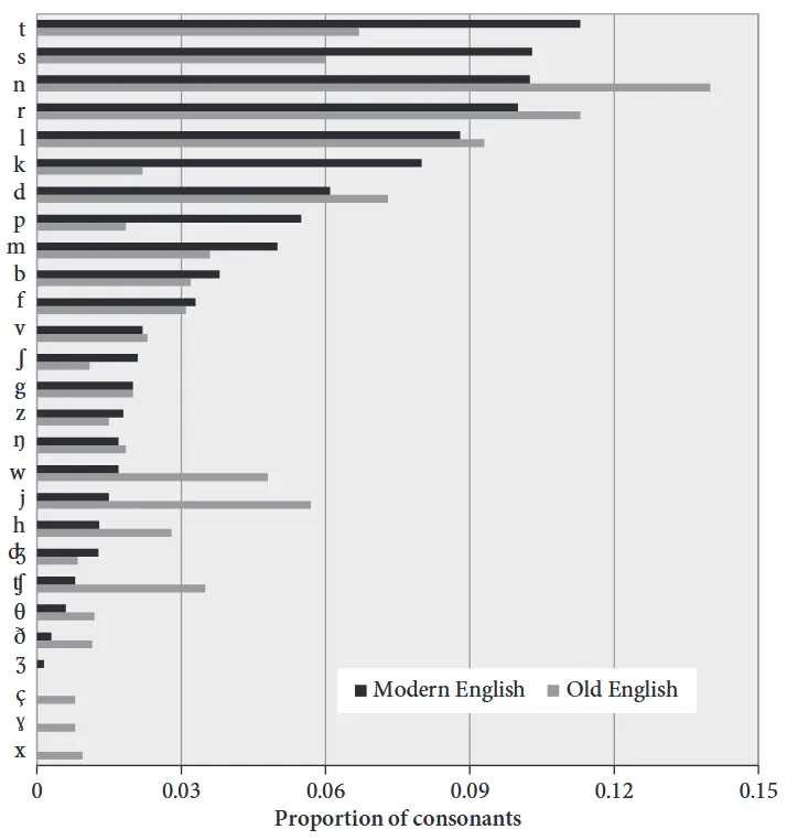 This hasn’t always been the case in English, though. In Old English, the most common consonant sound when measured by dictionary words was /n/! (Are you starting to see the pattern here?) The following chart compares the dictionary frequencies of consonants in Old English vs. Modern English.