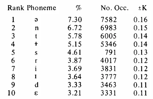 - Mines, M. Ardussi, Barbara F. Hanson, & June E. Shoup. 1978. Frequency of occurrence of phonemes in conversational English. Language & Speech 21(3): 221–241. DOI: https://doi.org/10.1177/002383097802100302.