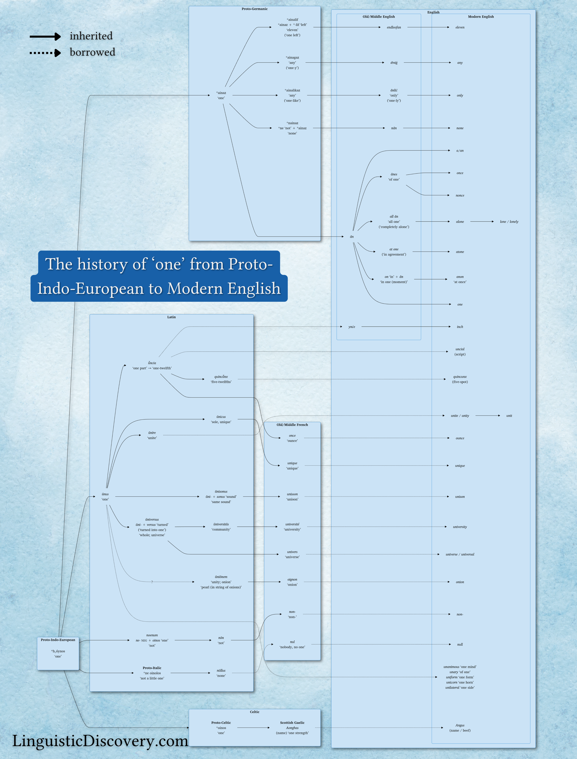 Today I’m going to take you on an etymological journey through the manifold histories of the word for ‘one’ from Proto-Indo-European 6,000 years ago to all the subtle ways that root is hidden in English today.